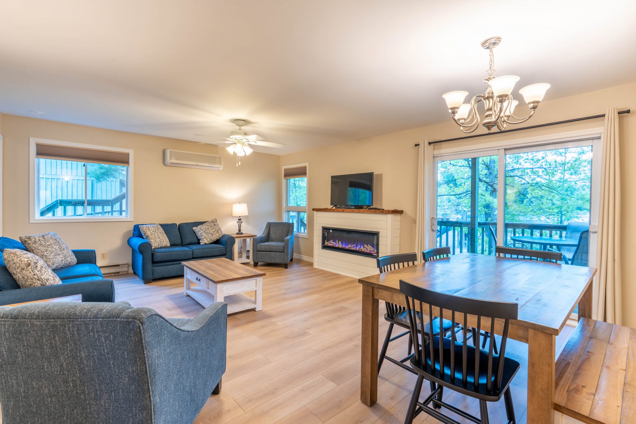Treetops #8 Lower is a first-storey resort townhouse with three bedrooms, two bathrooms, fully equipped kitchen and a spacious living room that includes a wood burning fireplace(Seasonal use only October 1st – April 30th) . Located behind the beach and playground, it has a large deck and a great view.